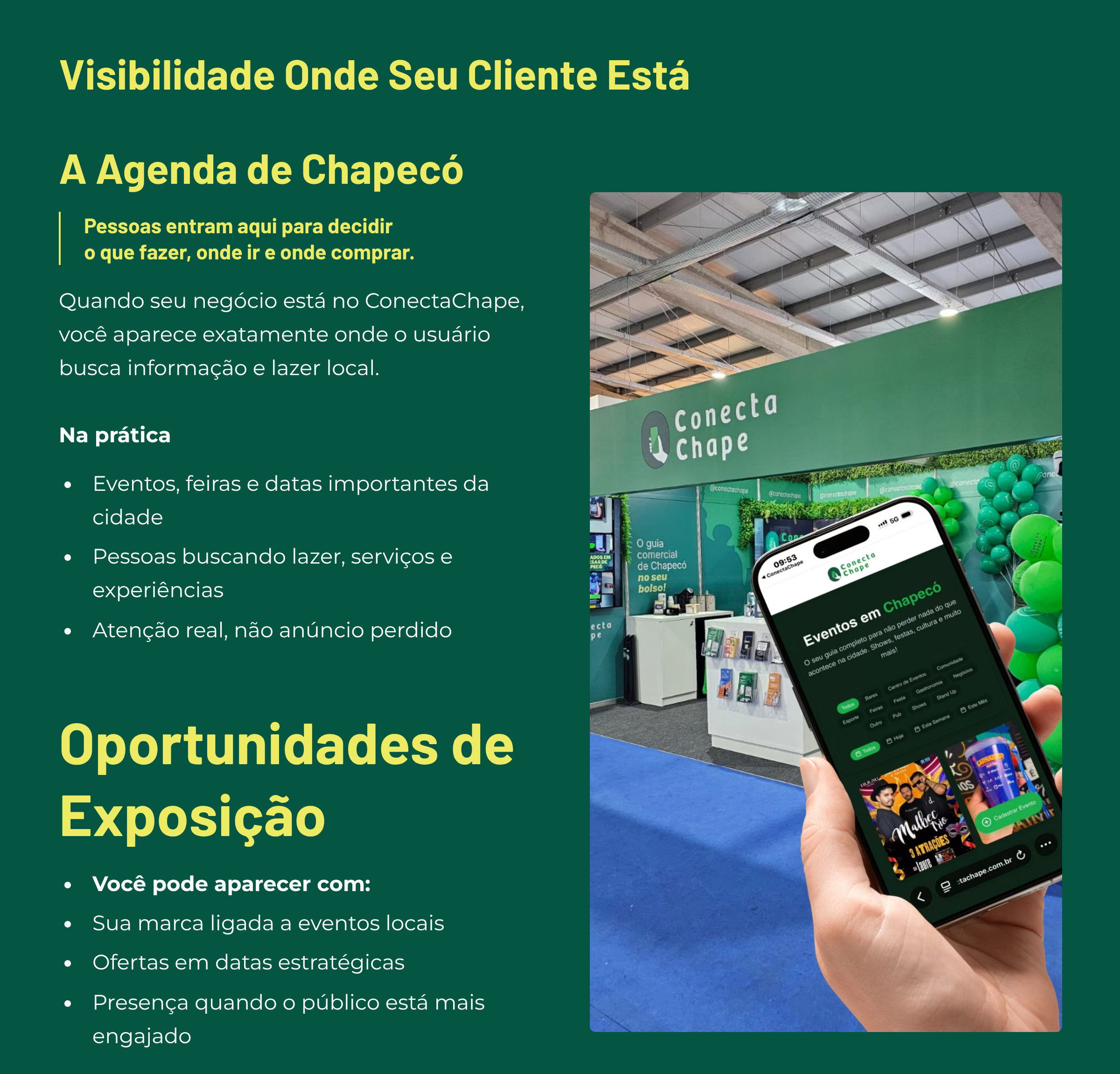 Em Chapecó as informações sobre comércios e serviços costumam ser divulgadas via internet, folders, painéis eletrônicos e indicações limitadas, que não atingem todo o público. O ConectaChape é um aplicativo que reúne tudo num só lugar, permitindo que moradores, turistas, empresas encontrem o seu negócio de forma rápida e prática — 24 horas por dia, diretamente pelo celular.